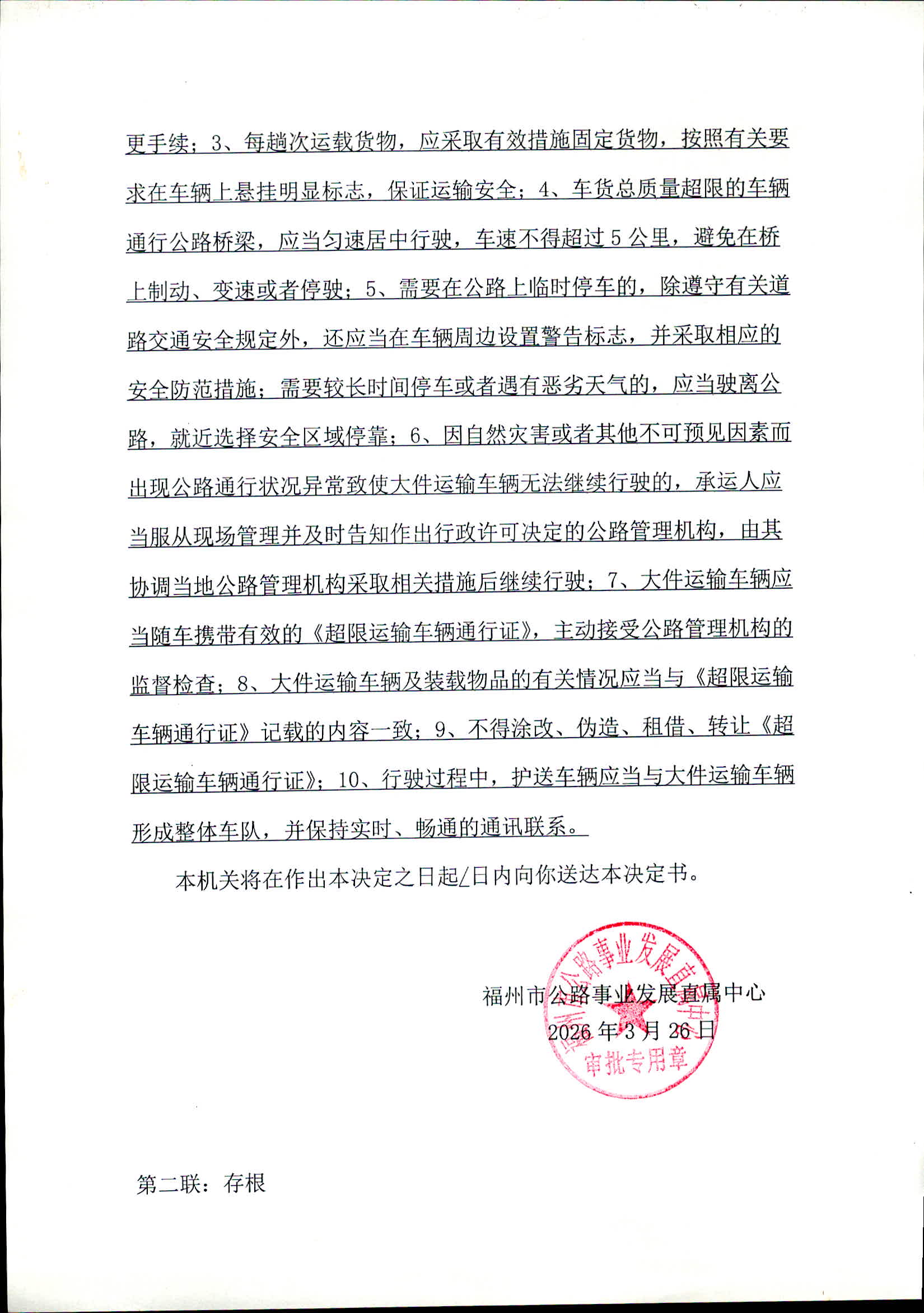福州市公路事业发展直属中心关于福州市瑜恒汽车运输有限公司2026年3月26日福建省公路路政行政许可决定书公示(闽榕直路政许〔2026〕第001号)