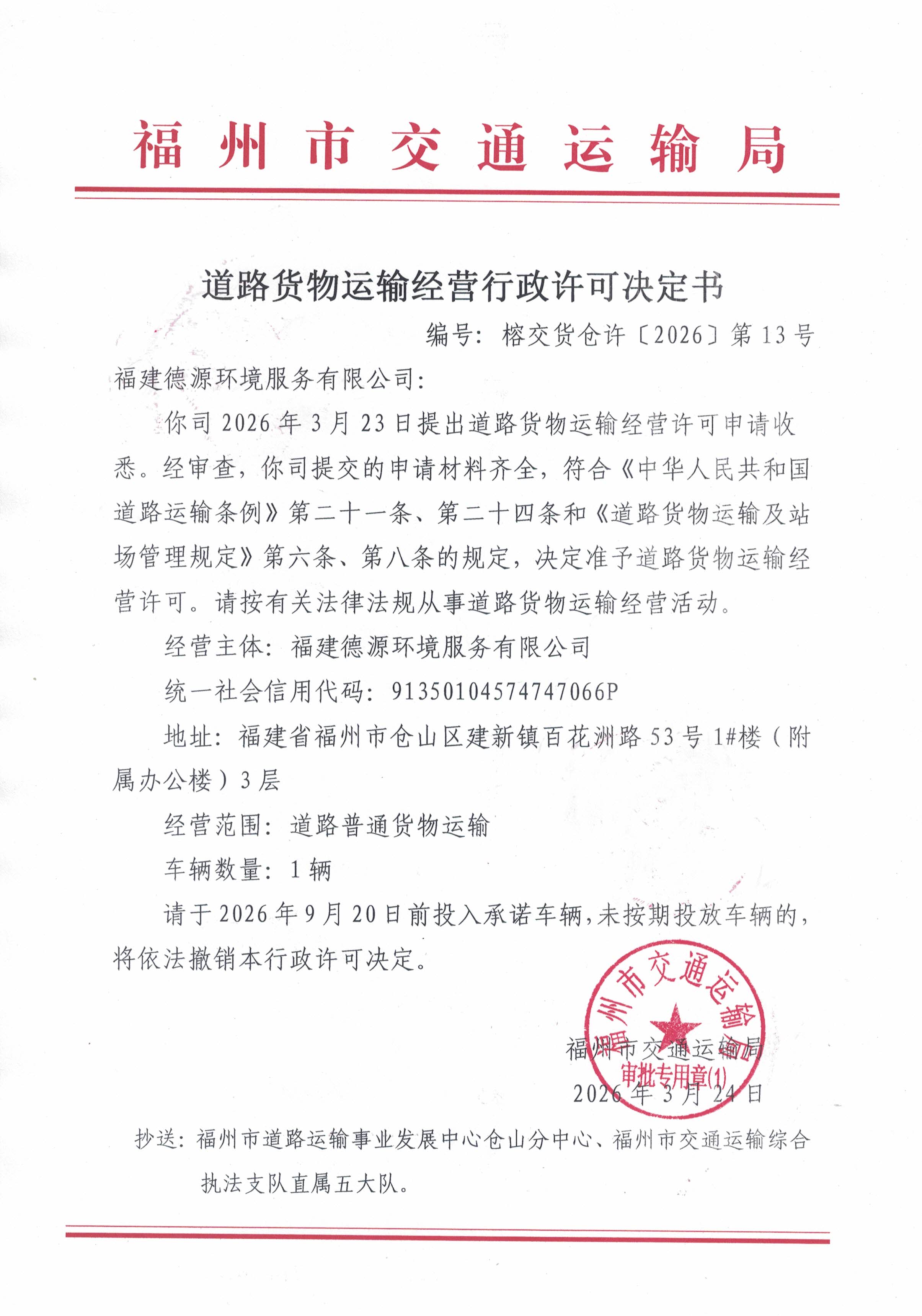 福州市交通运输局关于道路货物运输经营行政许可决定书(榕交货仓许〔2026〕第13号)