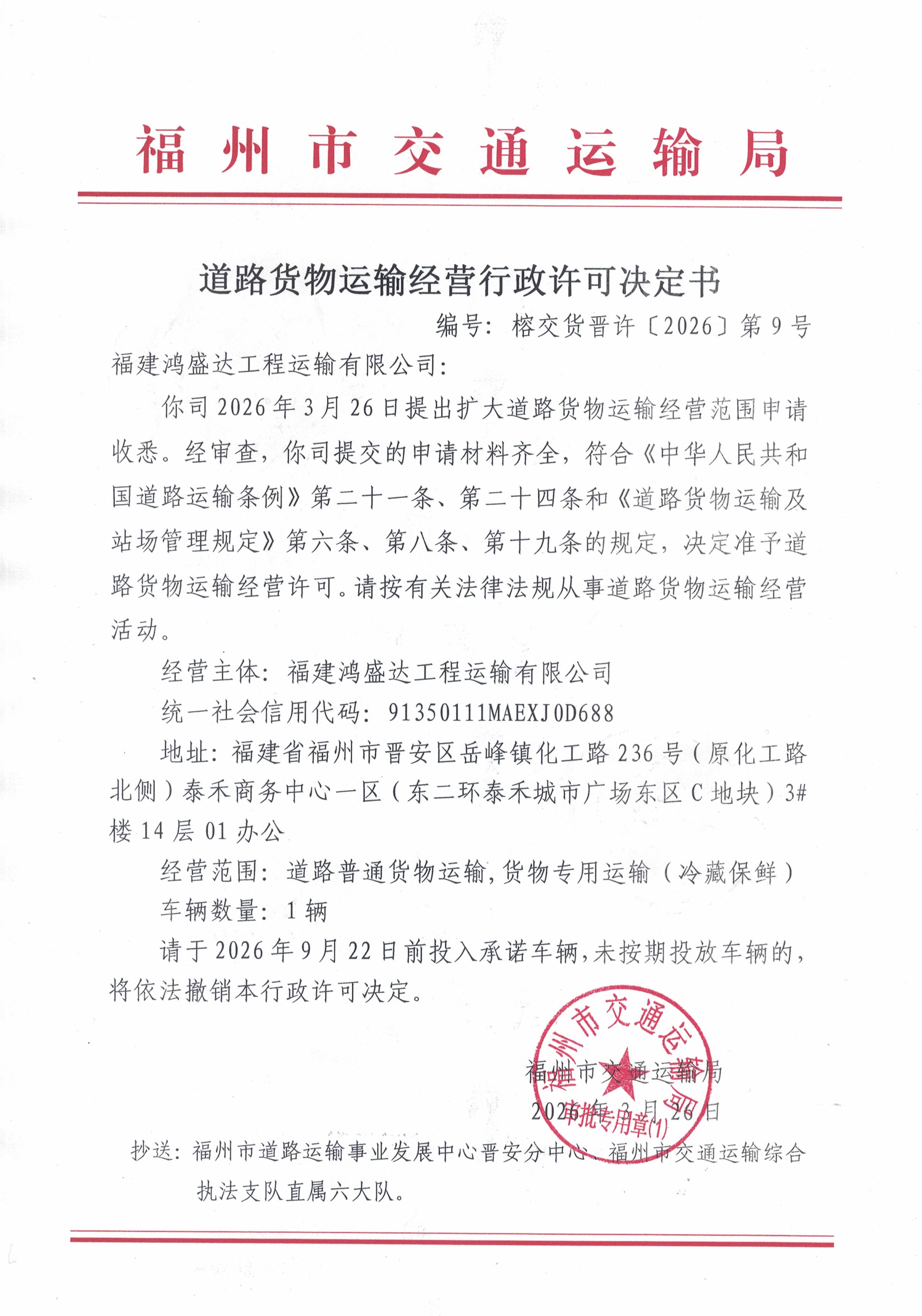 福州市交通运输局关于道路货物运输经营行政许可决定书(榕交货晋许〔2026〕第9号)