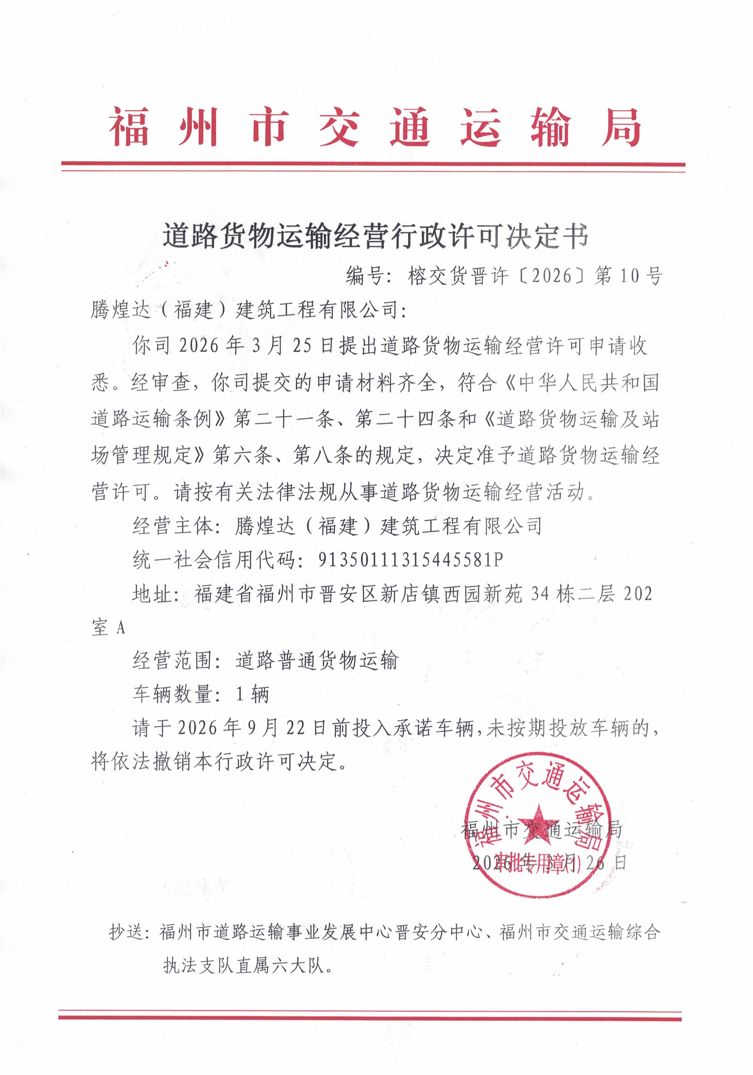 福州市交通运输局关于道路货物运输经营行政许可决定书(榕交货晋许〔2026〕第10号)
